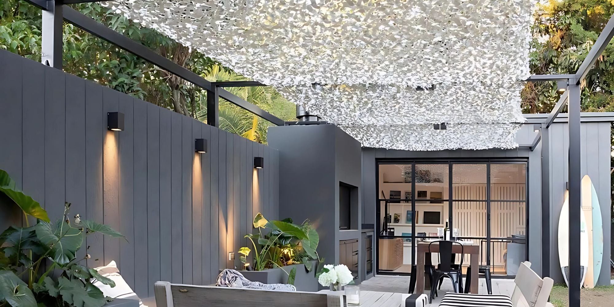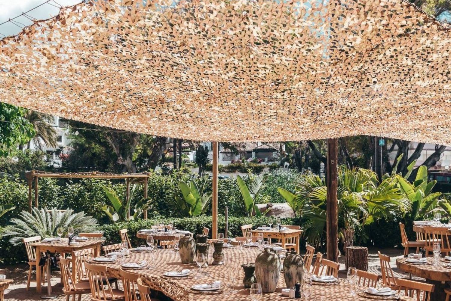 L'avantage d'un filet de camouflage est que l'air peut circuler sous la zone protégée, évitant ainsi l'effet de chaleur suffocante souvent observé sous des parasols ou des voiles d'ombrage traditionnelles. Cela leur confère également une meilleure résistance face aux vents forts d'où l'importance d'avoir un ombrage partiel.
